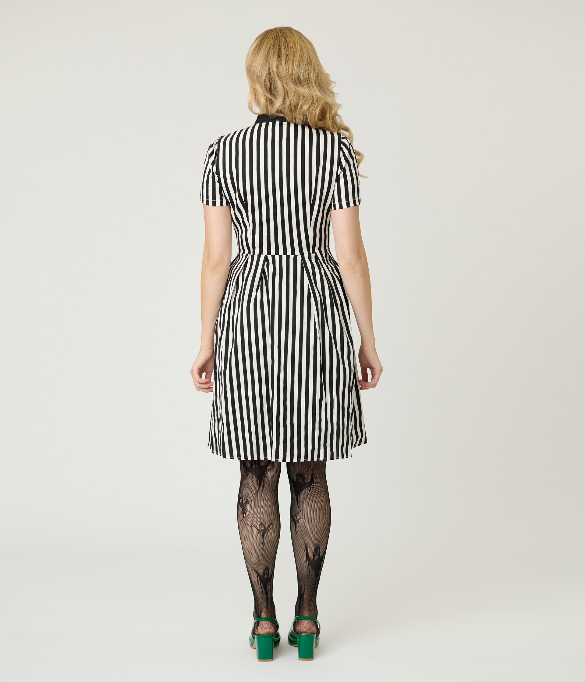 The coolest retro 50’s style swing dress, but in black & white stripes! A super cute and flattering outfit for any event, featuring a sweet neckline bow, buttons down the front and short sleeves!