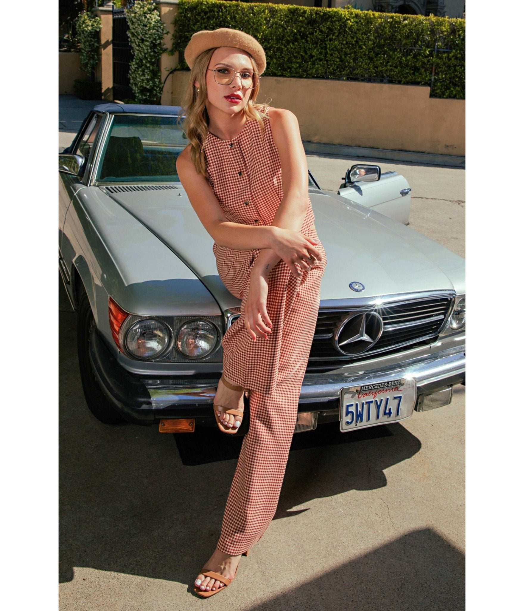 These fabulous pants are crafted in a lightweight woven fabric and set in a stunning burgundy and white houndstooth pattern. The mid rise waistline is nipped in with back elastic and a front zipper, while the wide legs boast side pockets!