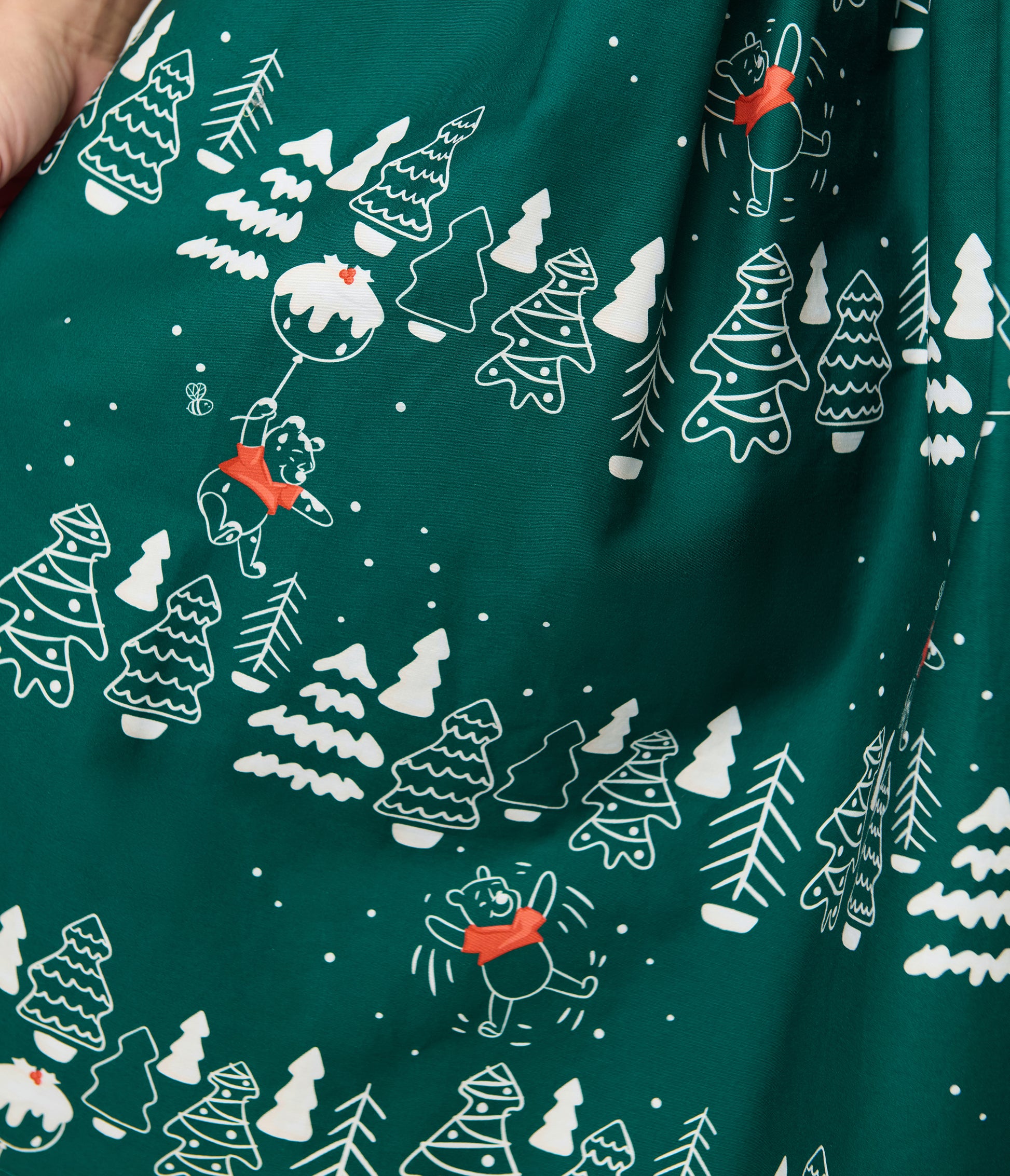 This adorable 1950's style swing dress, in collaboration with Disney and made by Unique Vintage, is set in green cotton and features an all over holiday print of Winnie the Pooh and Christmas trees. Complete with a button up front, a belt, and side pockets.