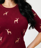 This sweet sweater is crafted in a soft burgundy knit and boasts embroidered deer throughout. Complete with short sleeves and a scoop neck!