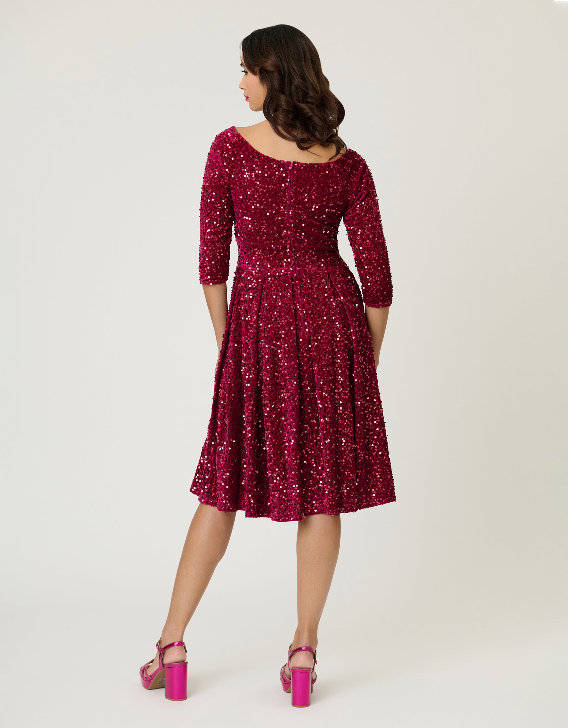 This dazzlingly 1950s dress is crafted in a fabulous burgundy velvet that shimmers with green sequins throughout. The sultry surplice neckline is framed by slender half sleeves, while an elegant swing skirt dances with box pleats with side pockets, and is cinched by a contrasting red belt with heart shaped buckle!