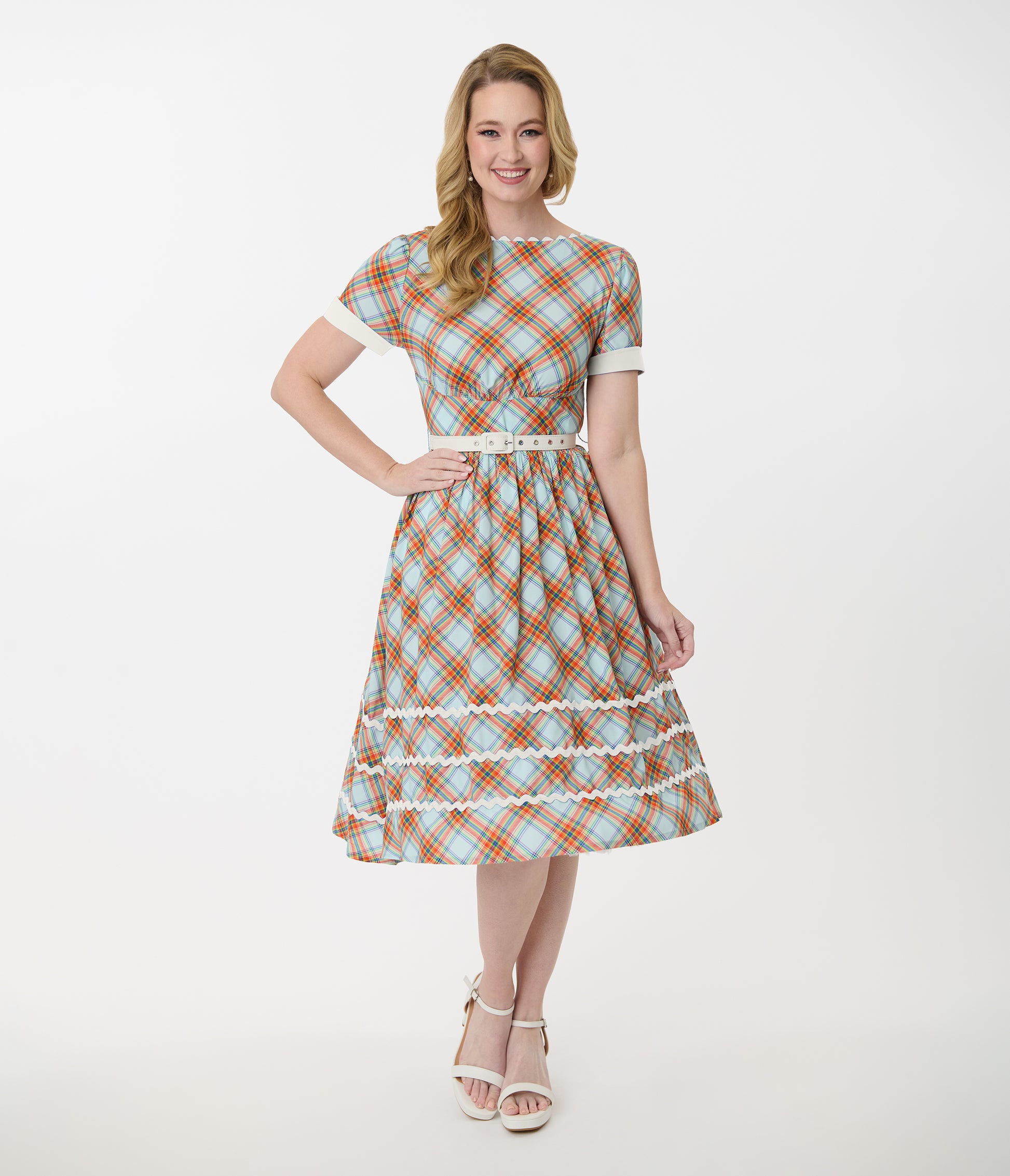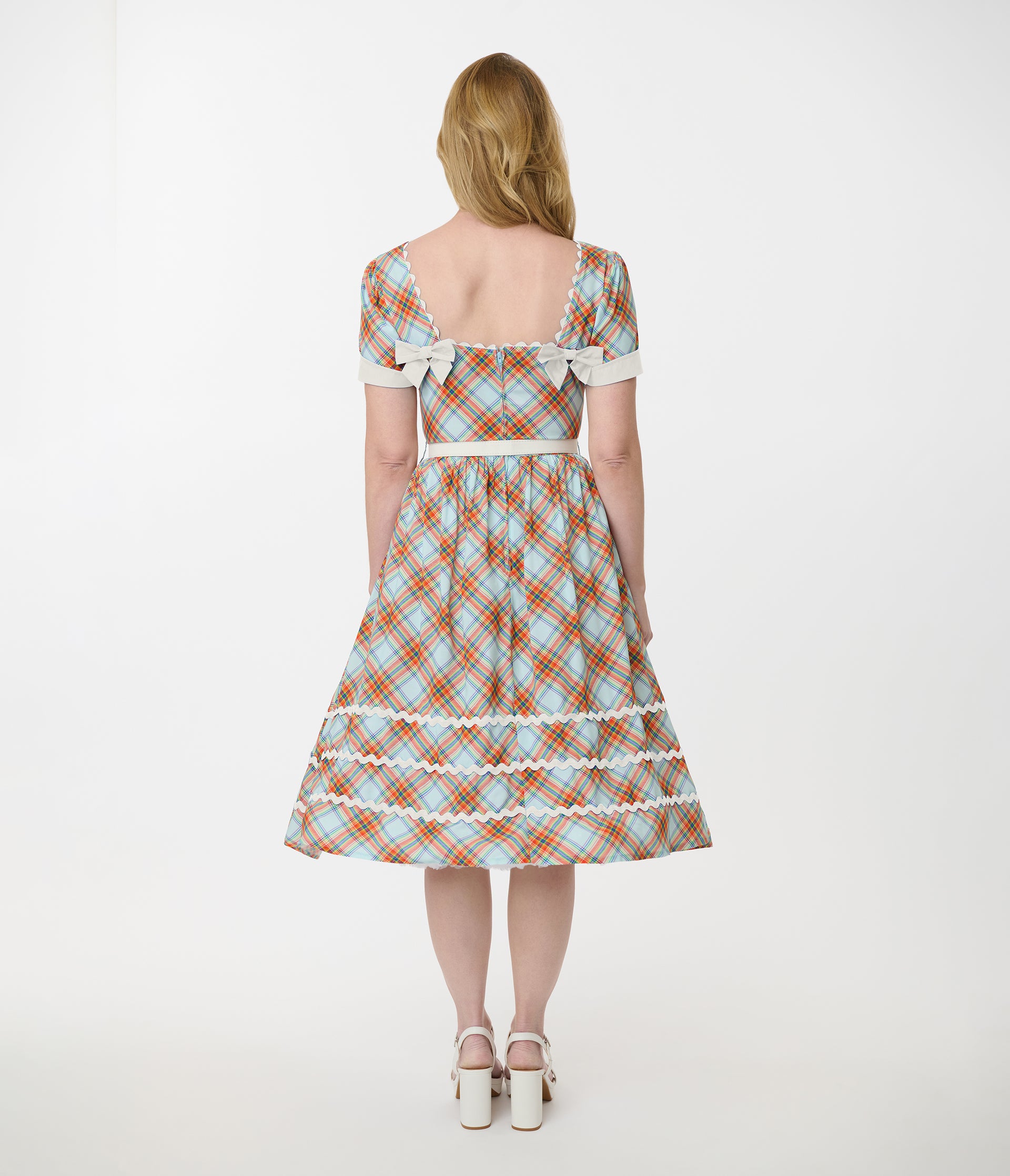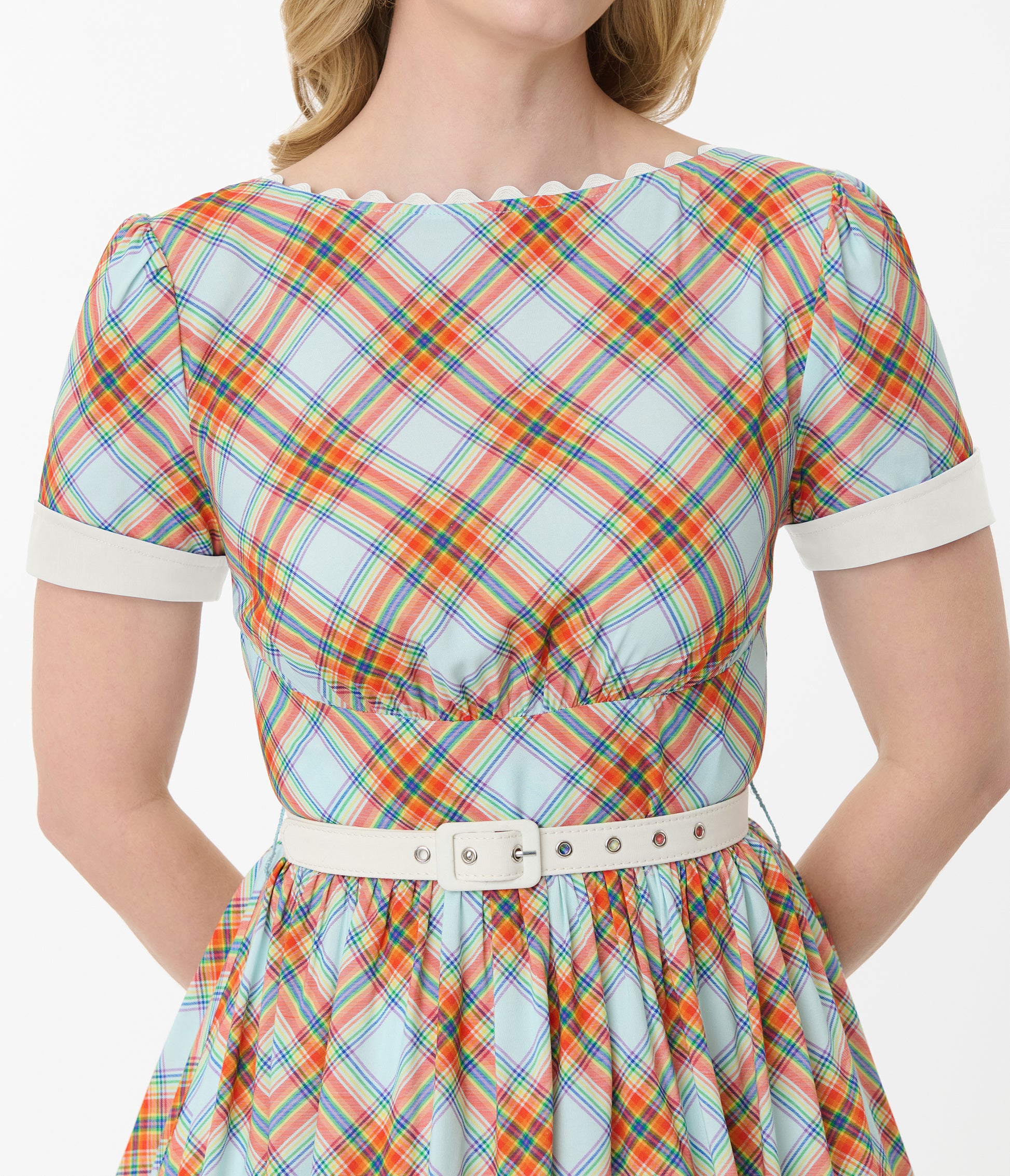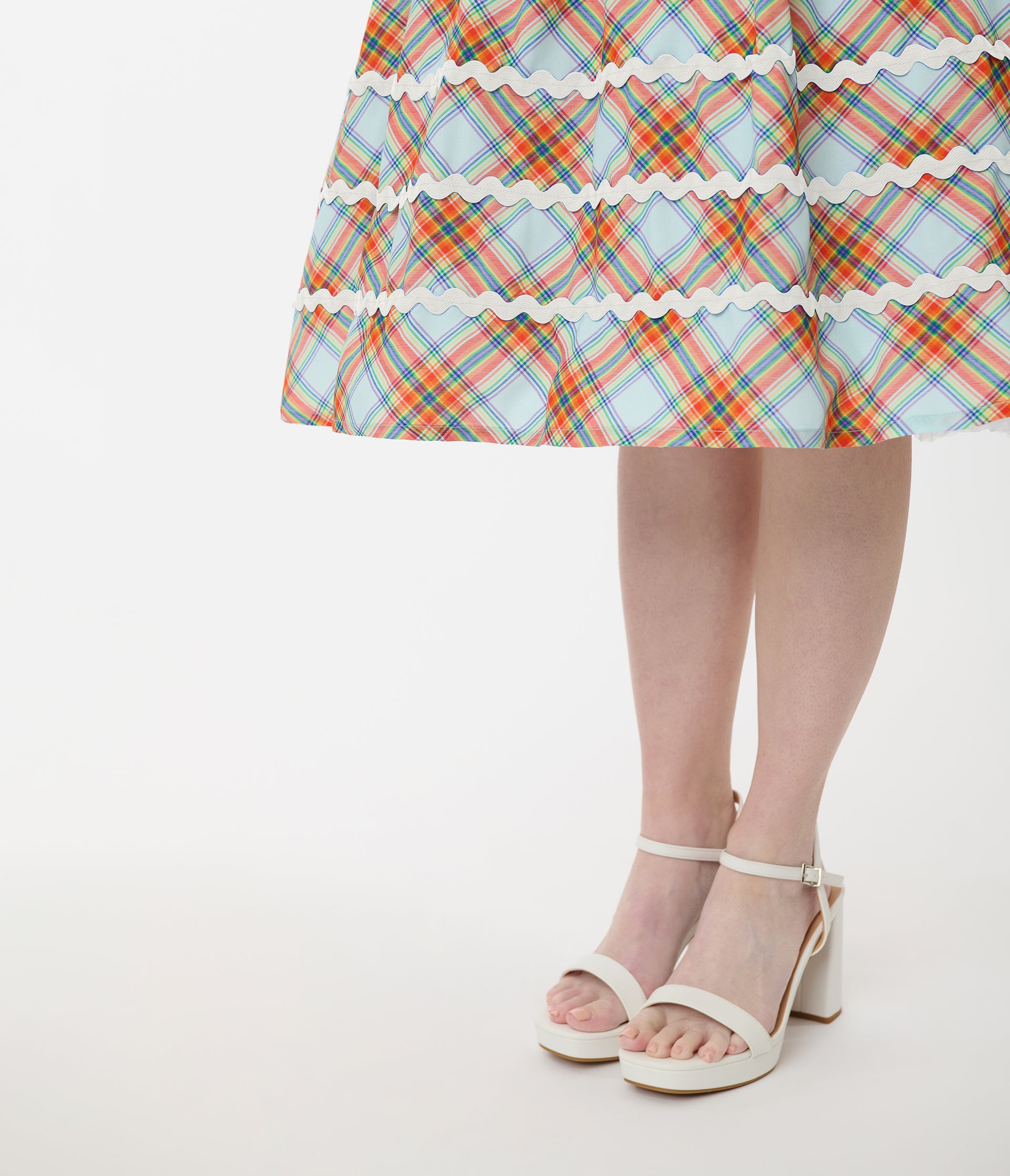 This beautifully 1950s woven dress showcases a vibrant rainbow plaid that will make you feel like a breath of fresh air. The delicate white ric rac detailing adds an extra touch of elegance, while the included white belt cinches your waist for a flattering silhouette. You'll love the sweet surprise of white faux bows on the back, adding a playful twist to your look. The scoop neck and convenient back zipper ensure comfort without sacrificing style.